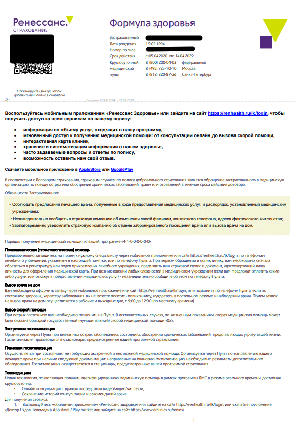 Так выглядит первый лист полиса на ДМС от работодателя. Он содержит номер полиса, срок его действия и телефоны для связи, если наступил страховой случай.